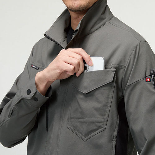 ビーエアクロス、4WAYストレッチ(伸長率25%)、高通気(50CC)、制電ケア設計、吸汗速乾性